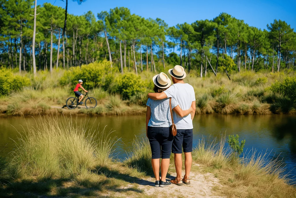 Mon coup de cœur absolu. Il existe une piste cyclable qui fait presque le tour complet du Bassin — l’un des plus beaux parcours à vélo de France. On longe l’eau, on traverse les villages, on s’arrête où on veut. En groupe avec des vélos loués pour la journée, c’est une activité légère, conviviale et magnifique. Comptez 20 à 40 km selon votre courage — mais avec le vent dans le dos et le Bassin à portée de regard, vous n’aurez pas vu le temps passer.